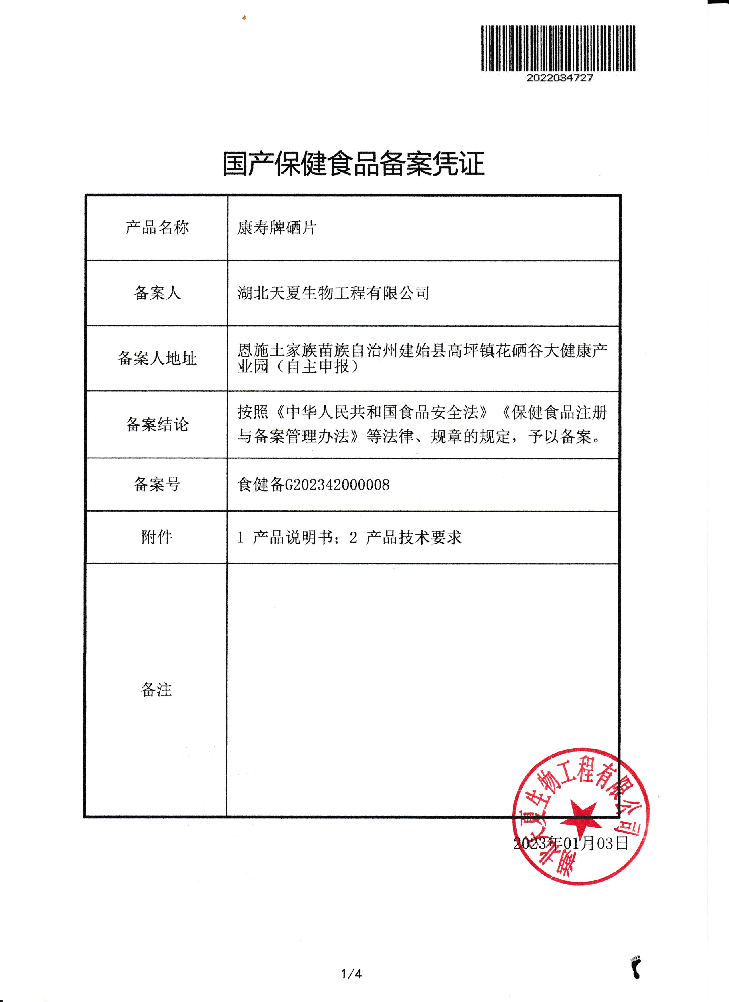 湖北天夏生物工程有限公司最新研發(fā)的高含量、純植物硒片“康壽牌硒片”獲得市場(chǎng)監(jiān)督管理局保健食品備案批準(zhǔn):